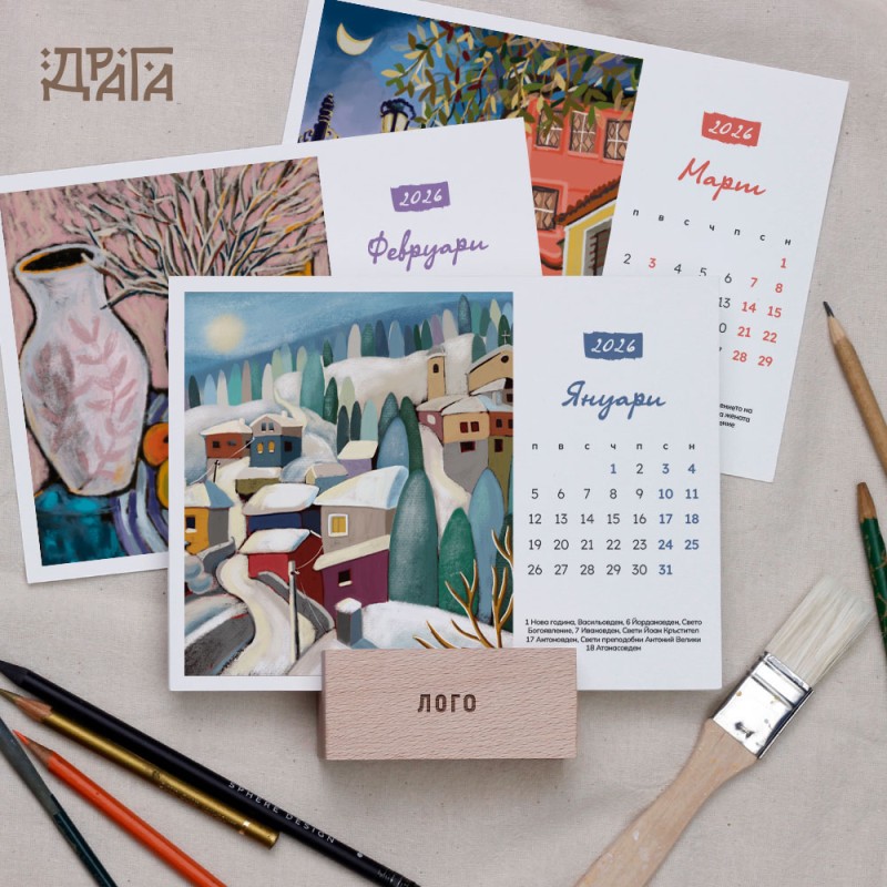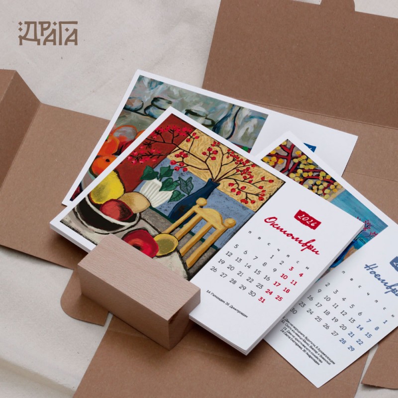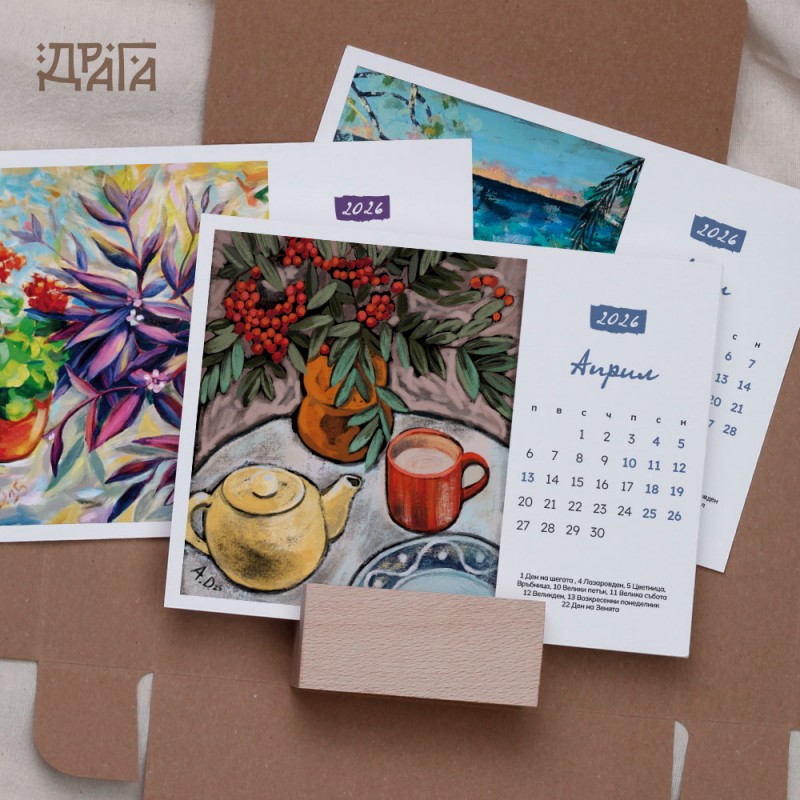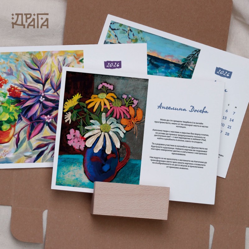 Авторски календар с творби на Ангелина Досева с дървено кубче-поставка